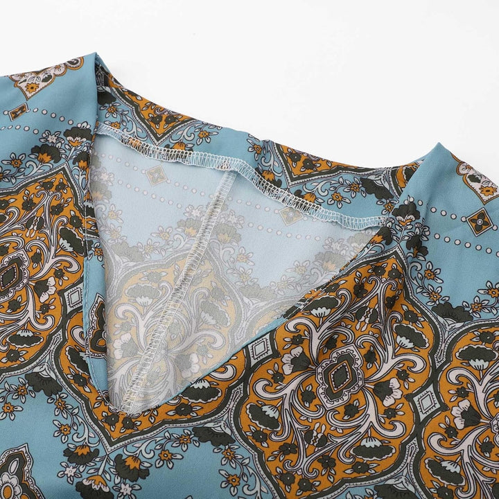 Women's Flowy Ethnic Puff Long Sleeve Midi Dress Casual Boho Floral Swing V-Neck Vacation Ruffle Dress with Belt
